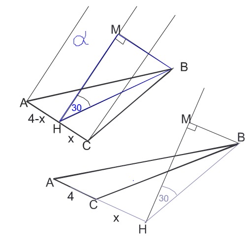 Длины сторон треугольника АВС соответственно равны:ВС=15см,АВ=13см,АС=4см.Через сторону АС проведена плоскость а,составляющая с плоскостью данного треугольника угол 30 градусов.Найти расстояние от точки В до плоскости а.