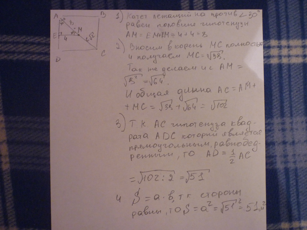 На диагонали АС квадрата ABCD взято точку М,так что МС =6√2. Расстояние от точки М к стороне AD равно 4 см. Найти площадь квадрата.
