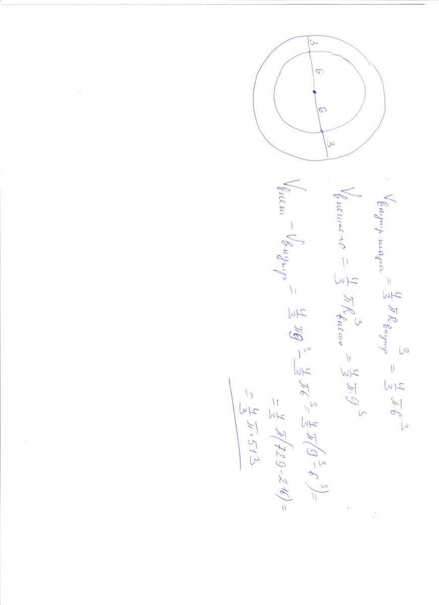 найдите обьем резины необходим для изготовления надутого воздухом мяча .если внешний диаметр этого мяча равна 18 см , а толщина стенок - 3 см.