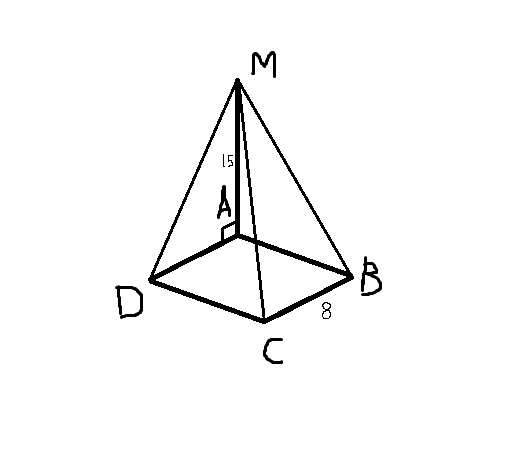 Через вершину А квадрата АВСД проведена прямая АМ, перпендикулярная плоскости ВСД. Найдите расстояние от точки М до вершины квадрата, если ВС = 8 и АМ = 15
