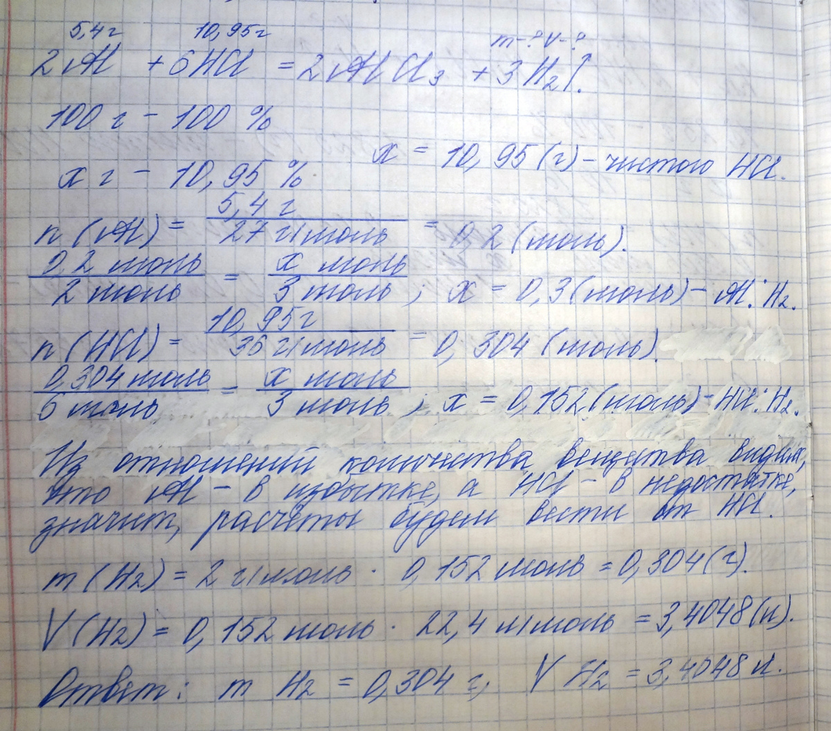 5,4 г алюминия обработали 10,95%-ным раствором соляной кислоты массой 100 г. Определите массу и объем (н. у.) выделившегося газа.