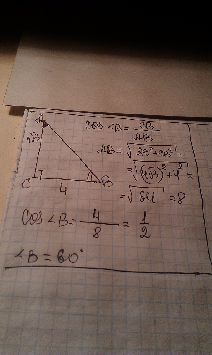 тогда cos B = BC/AB = 4/8 = 1/2 = 0,5.