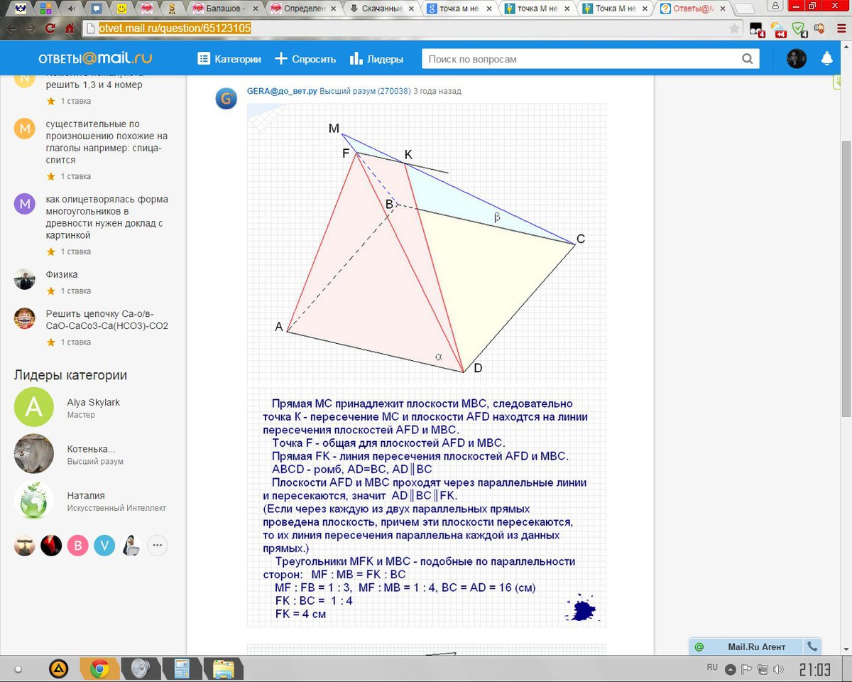 Точка M не лежит в плоскости ромба ABCD. На отрезке BM взята точка N так, что MN:NB=1:3. Точка К – точка пересечения прямой МС с плоскостью AND. Если AD=16, то отрезок NK равен...