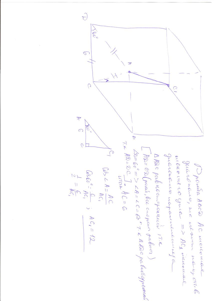 в основании прямого параллелепипеда лежит ромб со сторонами 6см и острым углом 60 градусов. найти меньшую диагональ параллелипипеда если она составляет с плоскостью основания угол 60 градусов .