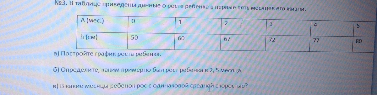 4 -5 = 3 см отсюда видно, что с одинаковой средней скоростью ребенок рос с 2 по 4 месяцы (по 5 см)