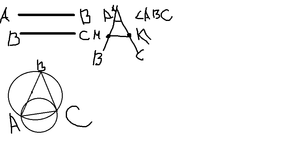 1 задача. проводим известную сторону треугольника, строим угол данному(Проводим окружность c радиусом 1/2AB,и проводим окружность радиуса MK) проводим через точку пересечения окружностей данную прямую BC, и проводим АС.