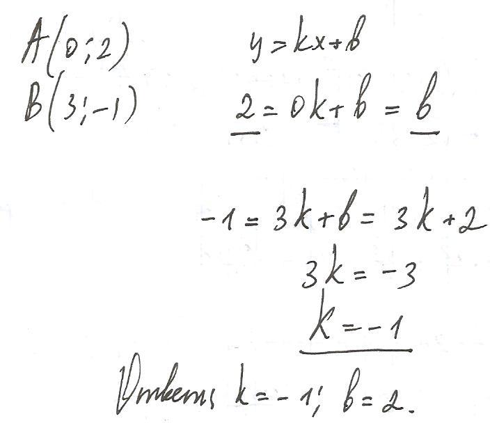 Прямая у = Кх + b проходитчерез точки А и В.Найдите числа К и b и запишите уравнение этой прямой,если А(0;2), В(3; - 1)