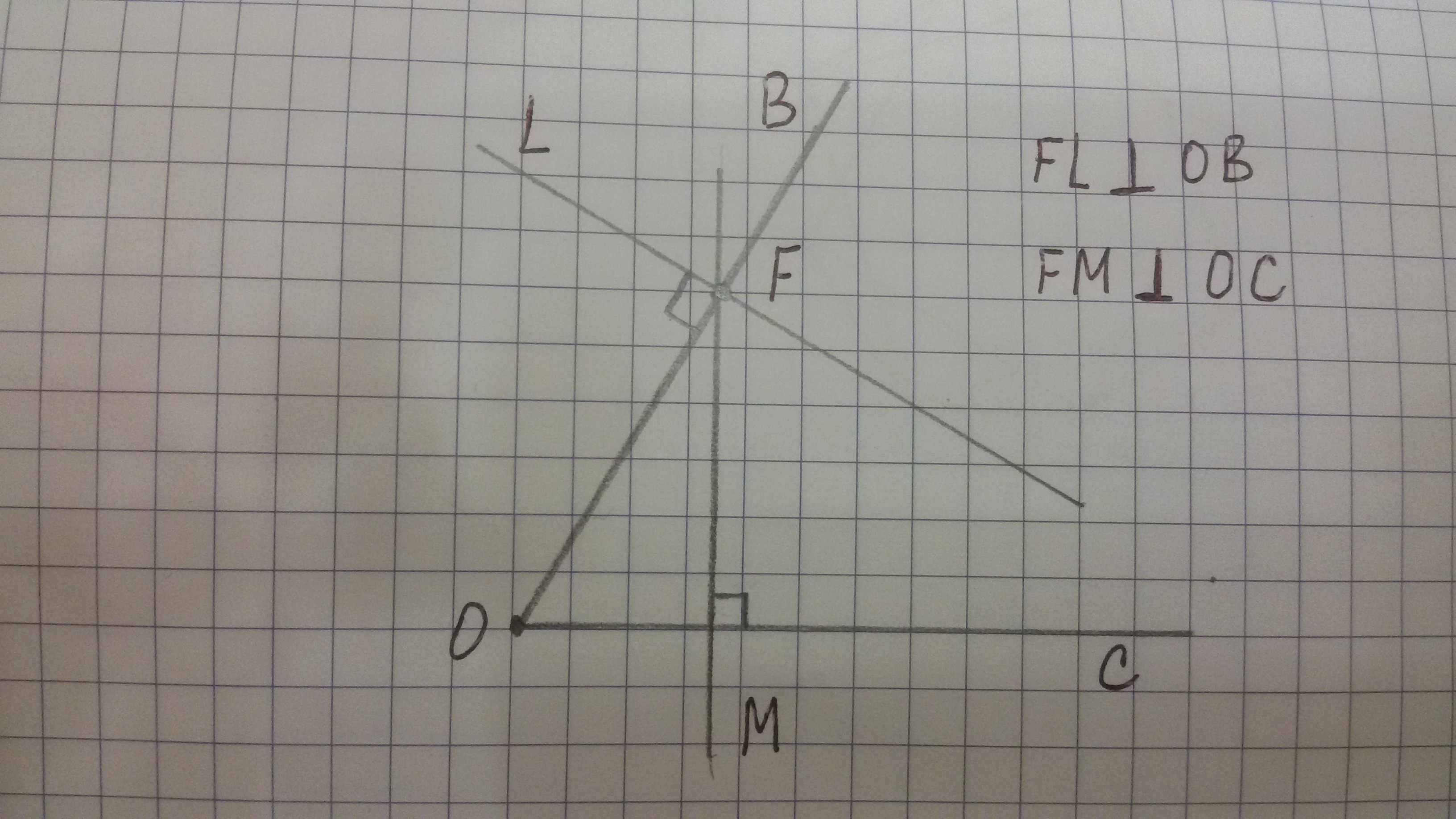 2. Постройте угол ВОС, равный 60°. Отметьте на стороне ОВ точку F и проведите через нее прямые, перпендикулярные сторонам угла ВОС.