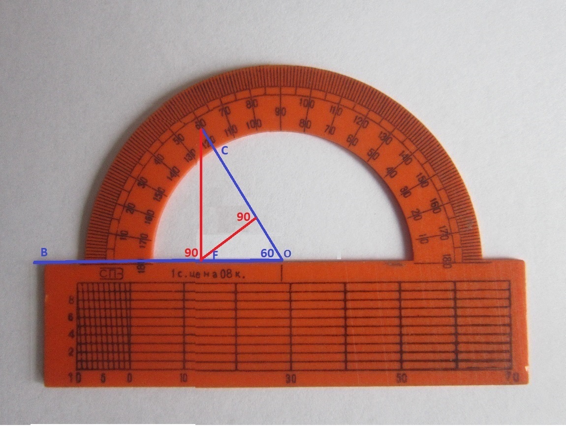 чертежный угольник с углами 30° и 60° и та же линейка..