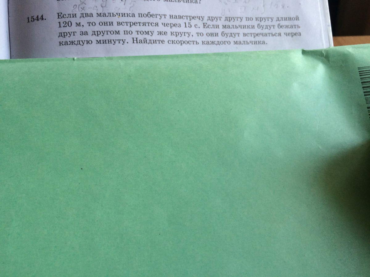 Пусть скорость быстрого мальчика равна х, медленного y. Если мальчики побегут навстречу, то в момент встречи они вместе пробегут половину длины круга, то есть 60 м. Получаем уравнение: