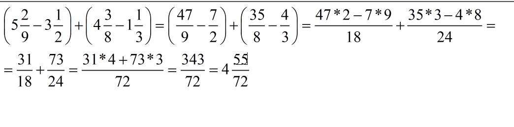 (5 2/9-3 1/2)+(4 3/8-1 1/3)=(47/9-7/2)+(35/8-4/3)=(94/18-63/18)+(105/24-32/24)=31/18+73/24=124/72+219/72=343/72=4 55/72