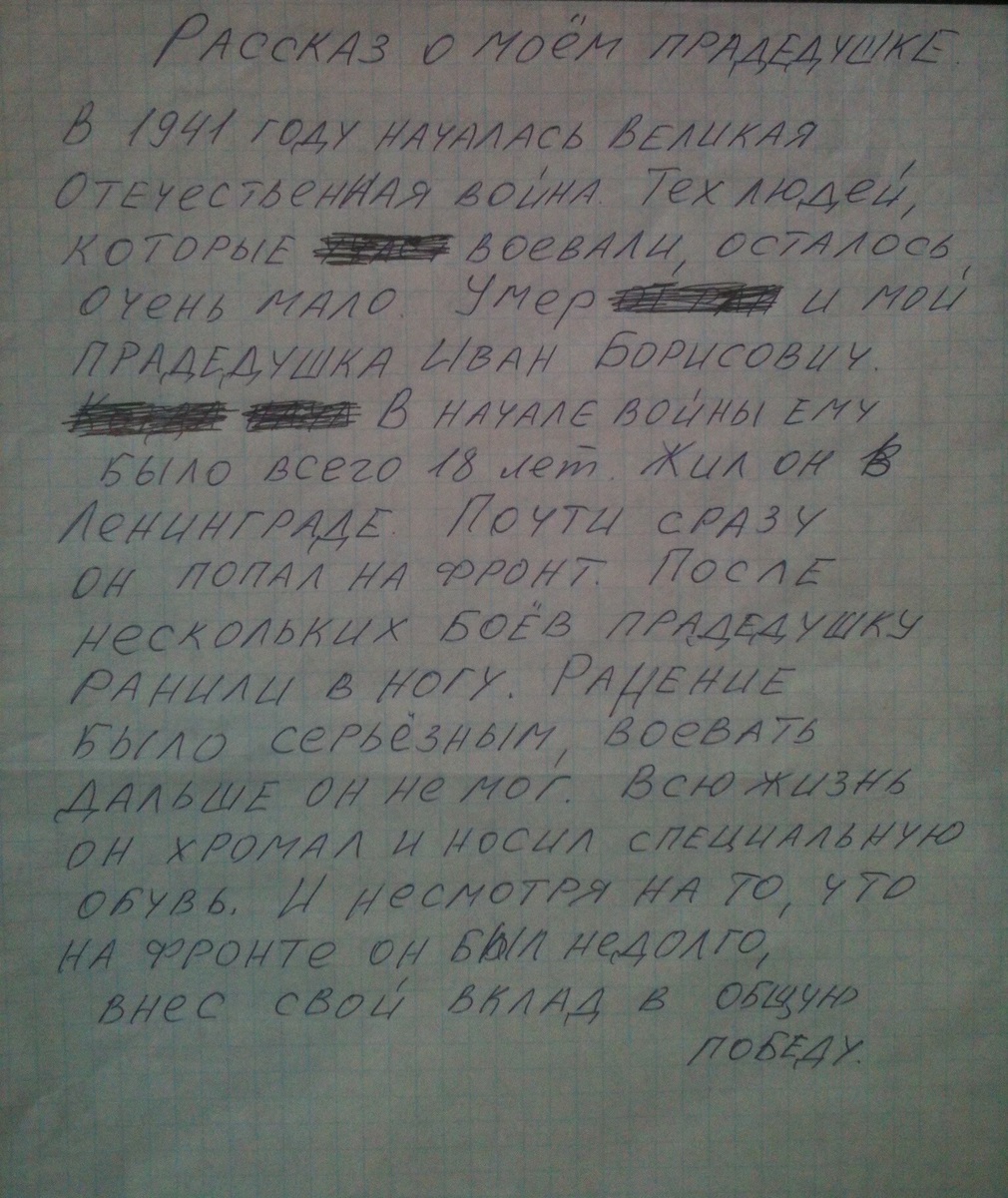 In 1941, the Great Patriotic War. Those who fought, there are very few. Died, and my great-grandfather, Ivan Borisovich.At the beginning of the war he was only 18 years old. He lived in Leningrade.Pochti once he got to the front. After several bouts great-grandfather was wounded in the leg. The wound was serious fight on, he could not. All his life he limped and wore special shoes. And despite the fact that it was not long Fonte, contributed to the overall victory.
