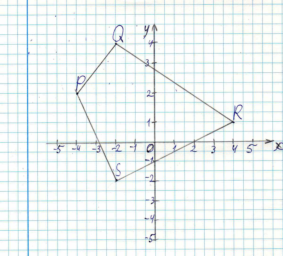 начертите на кooрдинатной плоскости четырёхугольник PQ RS, если P( -4, 2) Q ( -2, 4) R (4, 1) S (-2,-2)