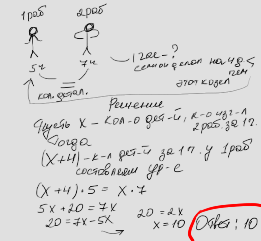 Первый рабочий за 5 часов изготовил столько же деталей, сколько второй за 7 часов. Сколько деталей изготовил за час второй рабочий если известно что он делал за 1 час на 4 детали меньше чем первый