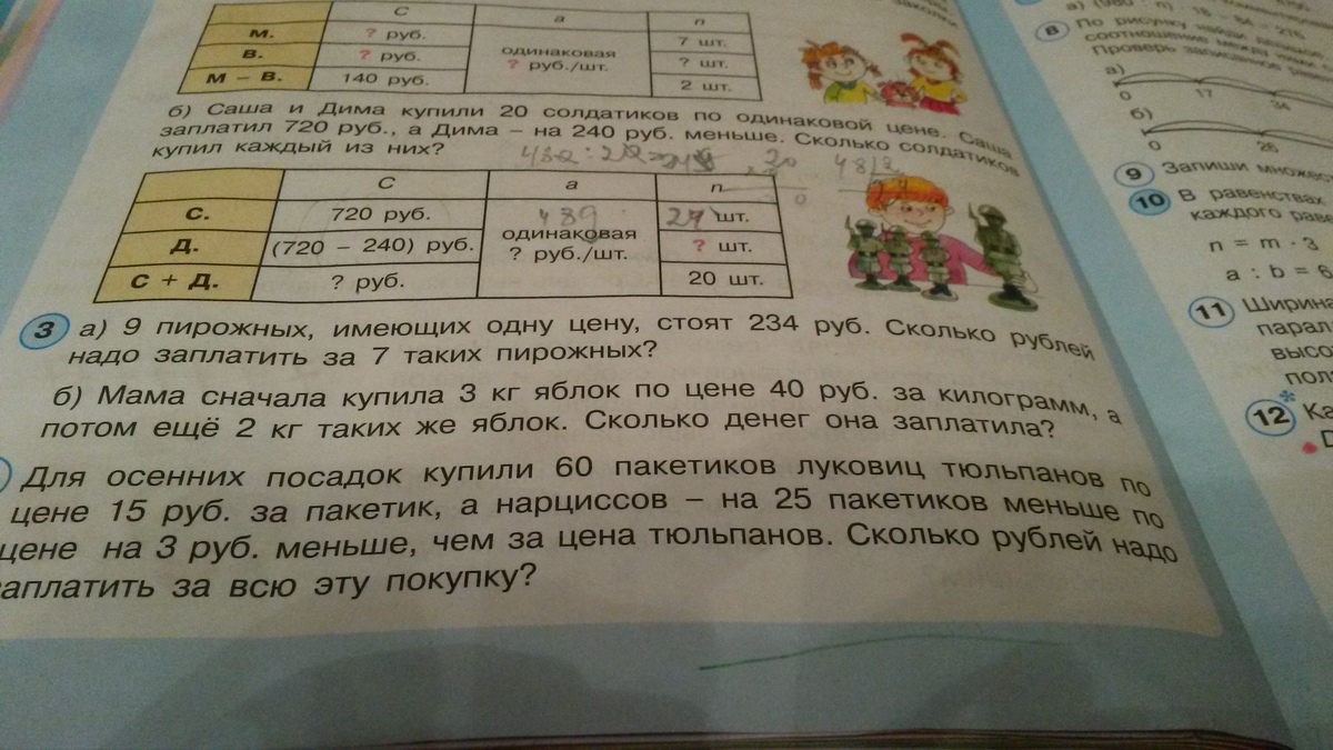 а)234:9=26(РУБ.)-ЦЕНЫ ПИРОЖНОГО 26*7=182(РУБ.) Б) 3плюс2=5(кг)-купила мама 40*5=200(руб)