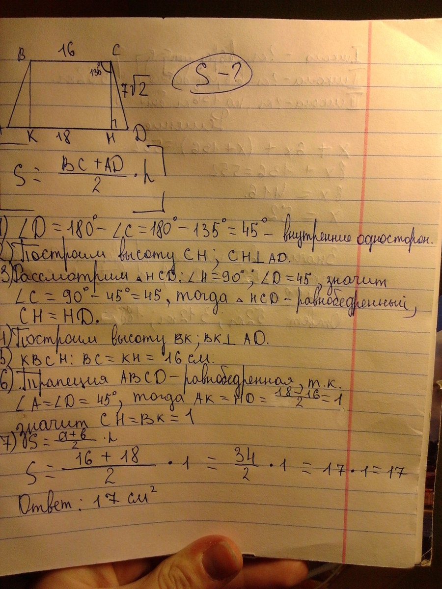 Основания трапеции равны 16 и 18, одна из боковых сторон равна 7v2, а угол между ней и одним из оснований равен 135o. Найдите площадь трапеции.