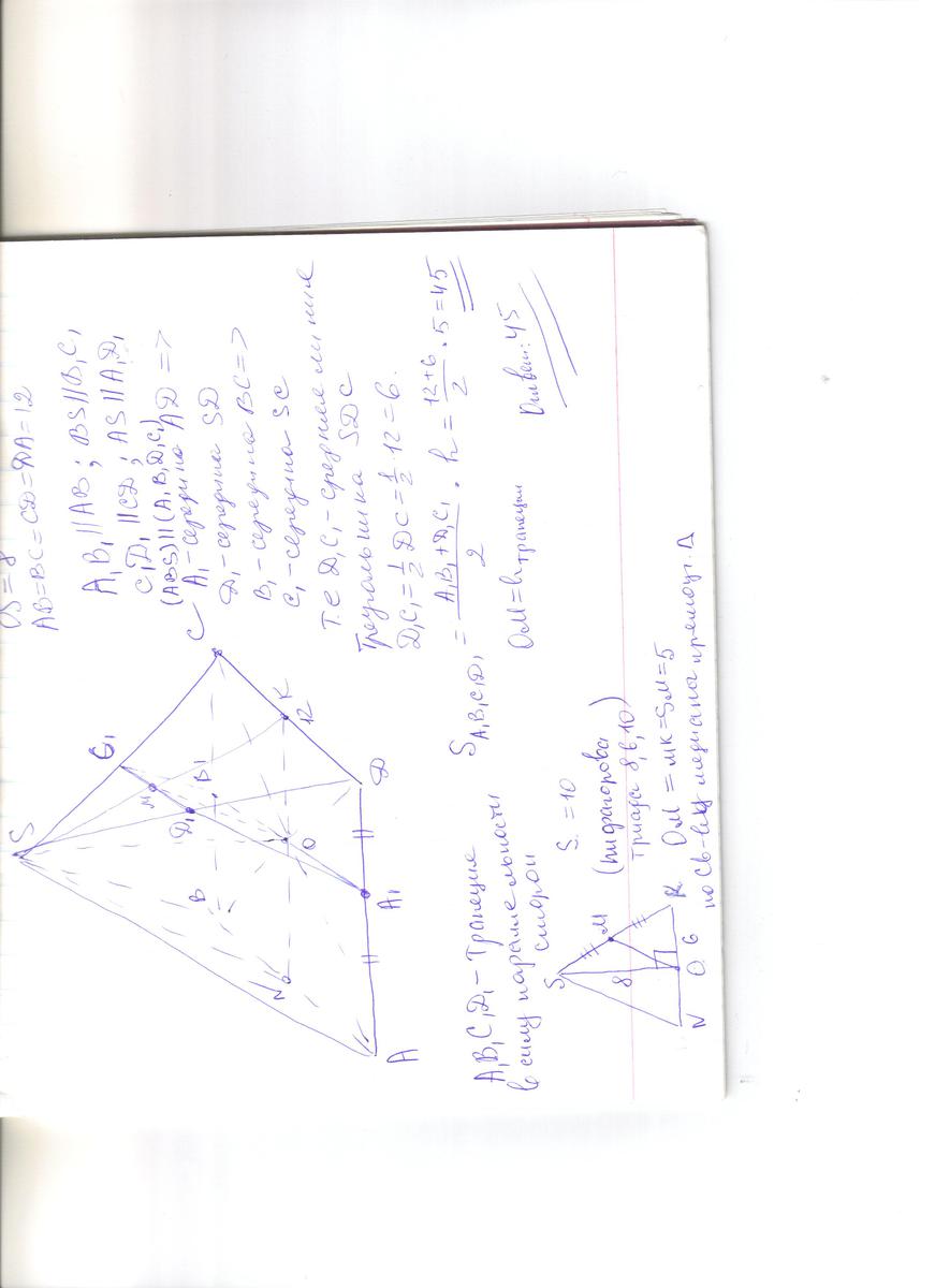 Высота правильной четырехугольной пирамиды равна 8,а сторона основания 12.Найдите площадь сечения пирамиды плоскостью,проходящей через центр основания и параллельной боковой грани пирамиды.