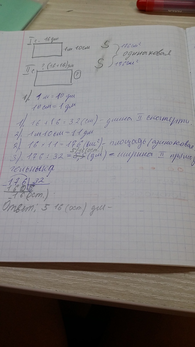 бабушка купила две скатерти одинаковой плищади. длина первой скатерти16 дм что на 16 дм меньше длины второй с катерти. найди ширину второй скатерти если ширина первой 1м 10 см.