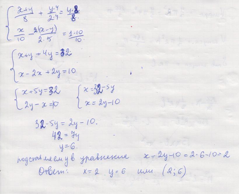 верхние все слогаемые домножаем на 8, нижнее домнажаем на 10. после складываем оба уравнения и выражаем Х, а после находим У. Х =-14 У= 9.6