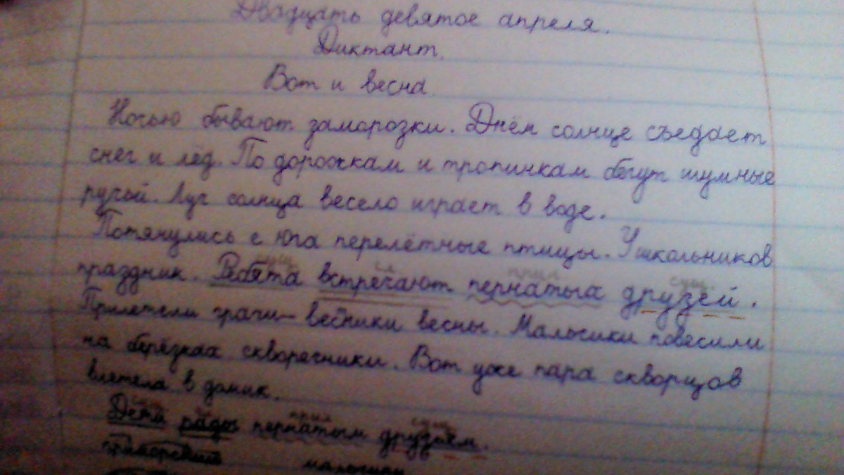 Проверяемые безударные гласные в корне: за`морозки (моро`з), тропи`нкам (тро`пы), бегу`т (бег), ве`село (весе`лье), (в) воде` (во`ды), потяну`лись (тя`нет), встреча`ют (встре`ча), прилете`ли (полёт), влете`ла (полёт), грачи` (грач), весны` (вёсны), скворе`чники (скво`рушка), скворцо`в (скво`рушка).