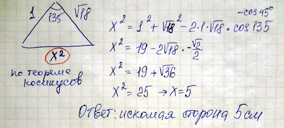 две стороны треугольника равны соответственно 1 см и корень из 18 см, а угол между ними равен 135 градусов. найдите третью сторону