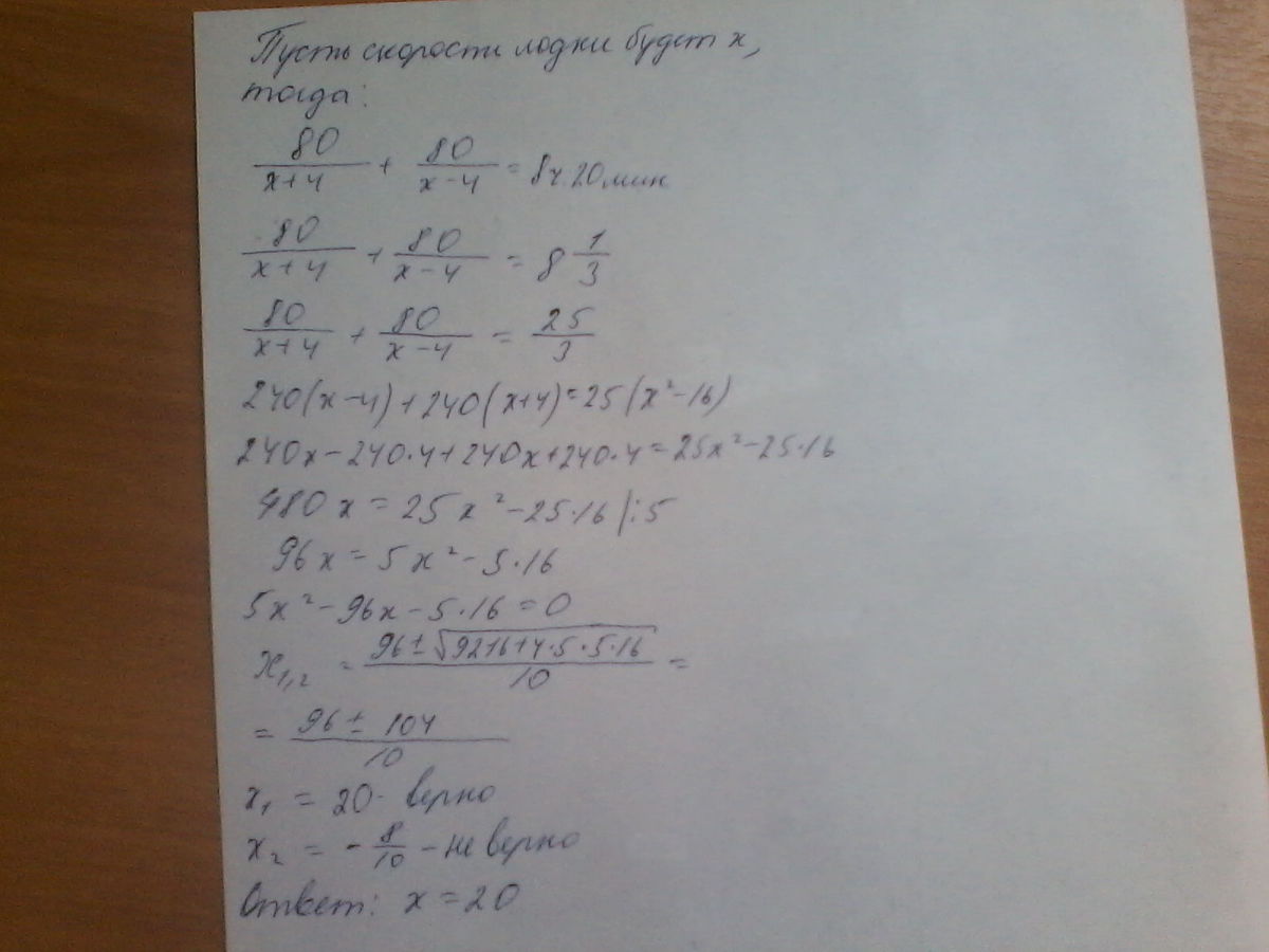 Расстояние между двумя пристанями по реке равно 80 км.Лодка проходит этот путь туда и обратно за 8 часов 20 минут.Определить скорость лодки в стоячей воде,считая скорость течения реки равной 4 км/ч