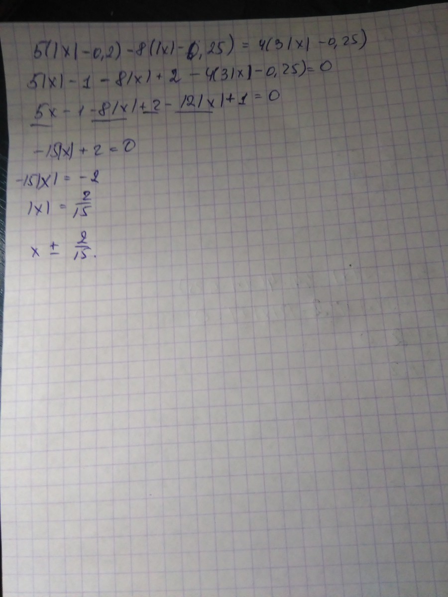 Решите уравнение:5( модуль х модуль закрываем-0.2)-8(модуль х модуль закрываем-1/4=4(3 модуль х модуль закрываем-0.25): Ответы должны получиться такой ответ +-2/15