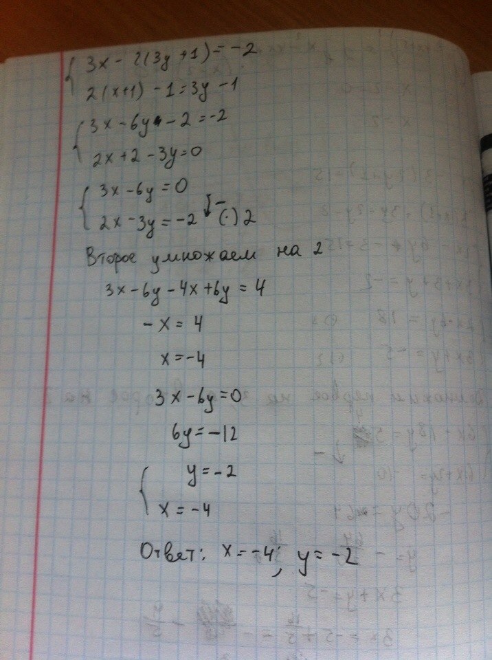 а это сможете пожалуйста!!! [3х-2(3у+1)=-2