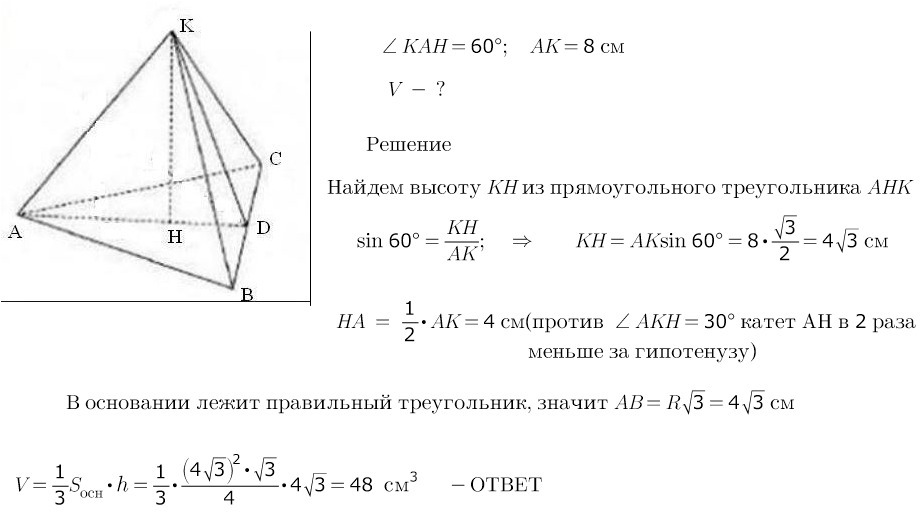 в правильной треугольной пирамиде боковые ребра наклонены к основанию под углом 60 градусов,длина бокового ребра 8 см.найдите объем пирамиды