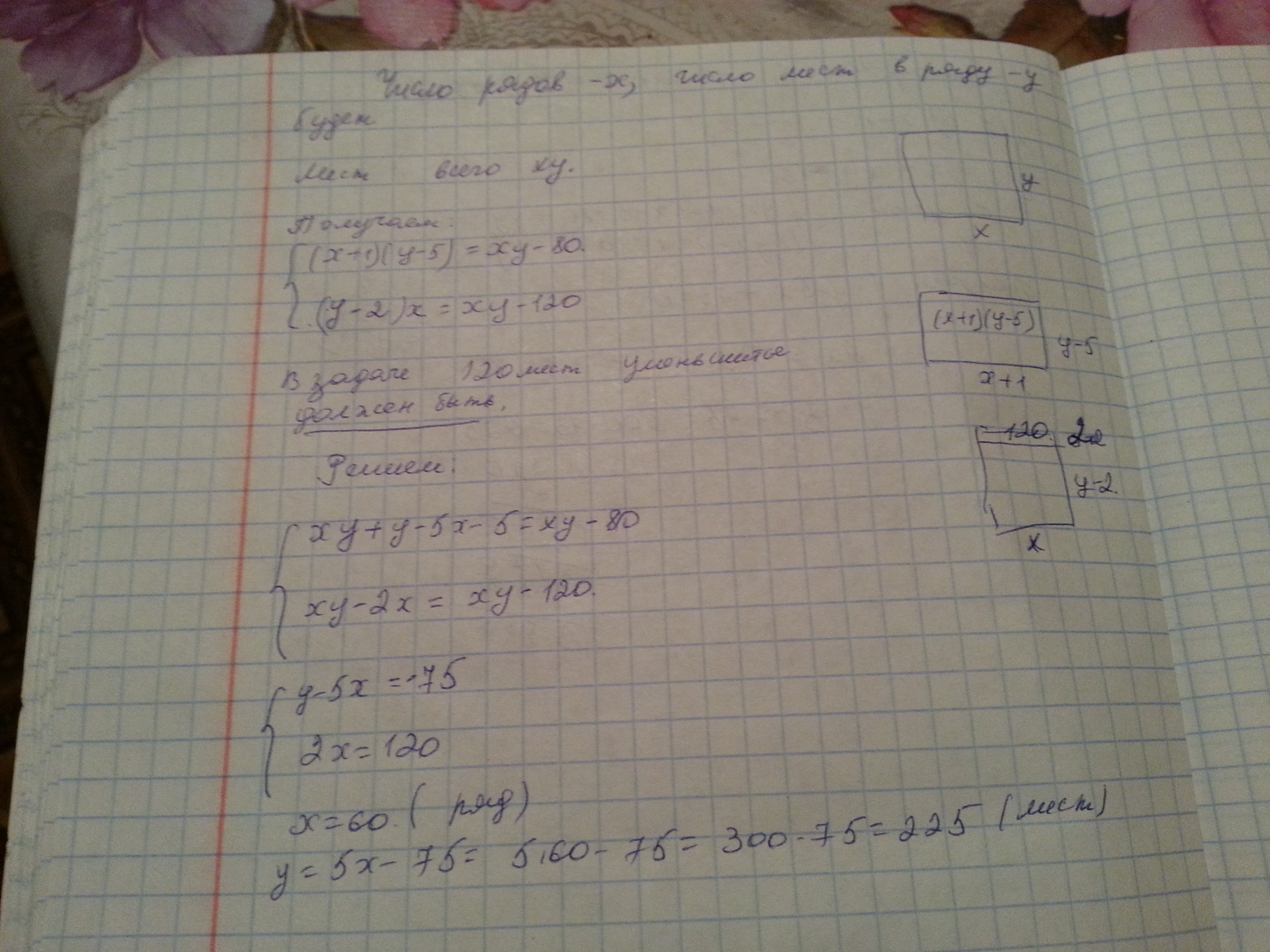 в зрительном зале клуба ряды содержат одинаковое число мест. если уменьшить число мест в ряду на 5, а число рядов увеличили на 1, то число всех мест в зале уменьшится на 80. если же число мест в каждом ряду уменьшить на 2, то число всех мест в зале увеличится на 120. найти число рядов и число мест в ряду.