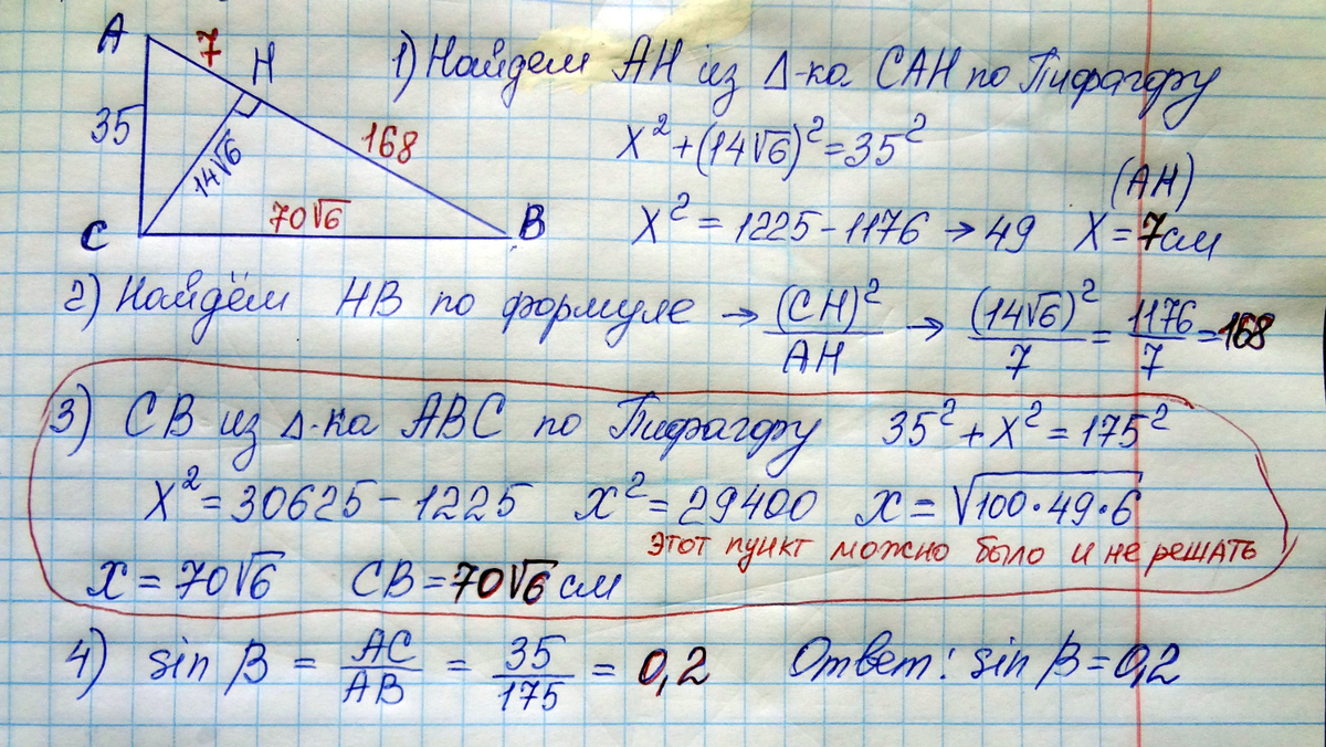 В прямоугольном треугольнике катет ас =35 , а высота ch , опущенная на гипотенузу, равна 14 корней из 6 Найдите sin угла АВС