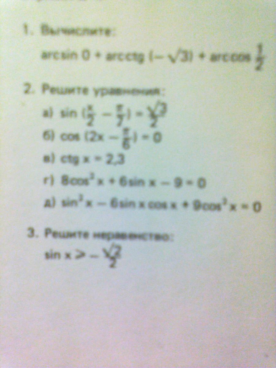 2 номер, 1 задание: sin ( x/2- п/2) = корень из трех деленное на2. x/2 - п/2 = (-1)*n arcsin корень из трех на 2 +пn, n Э z. x/2