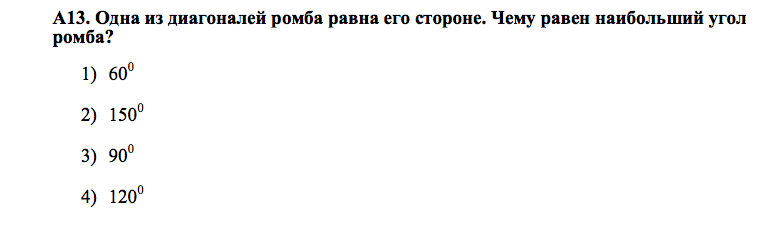 A13: треугольник получается равносторонний, в нем углы по 60. Диагонали ромба явл.биссектрисами, значит наибольший угол равен 2*60=120 градусов. Ответ: 120.