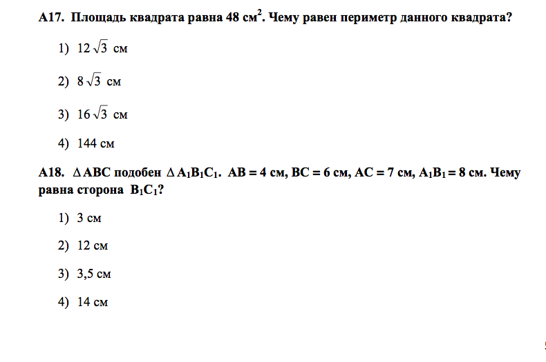 A17: x^2=48, тогда: x=4*кореньизтрех. Периметр равен 4x=16*кореньизтрех. Ответ: 16*кореньизтрех.