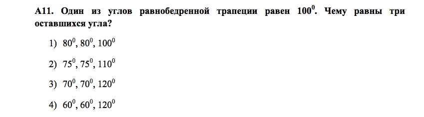 А11: ещё один угол равен 100, другие же как внутренние односторонние равны 180-100=80. Ответ: 100; 80; 80.