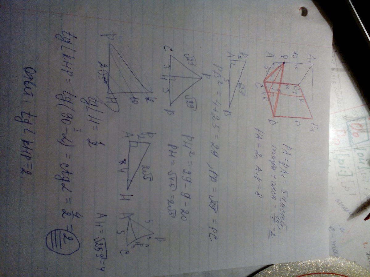 Основанием прямой треугольной призмы АВСА1В1С1 является равнобедренный треугольник АВС, в котором АВ=АС=5,ВС=6.Боковое ребро призмы равно 10. Точка Р принадлежит ребру АА1,причём РА1=4АР.Найти тангенс угла между плоскостями ВСР и ВСС1.Ответ: 2.(Если можно,подробно, с рисунком, с формулами.)