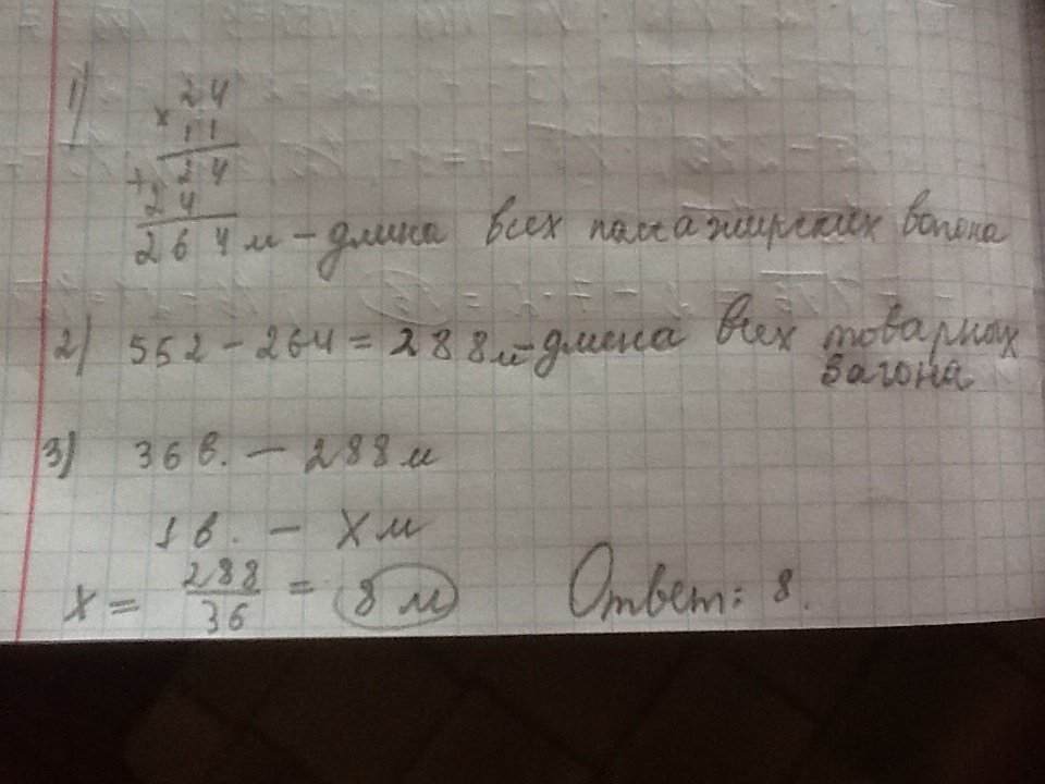 Решить задачу на запасном пути железнодорожной станции стоят в один ряд 36 товарных и 24 пассажирских вагона. Длина пассажирского вагона 11 метров.Чему равна длина товарного вагона если длина всего состава 552 метра?
