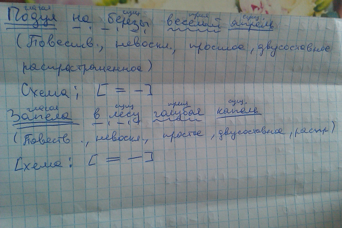 Подул(сказуемое) на(предлог) берёзы(дополнение) весёлый(определение) апрель(дополнение). Запела(сказуемое) в лесу(обстоятельство) голубая(определение) капель(дополнение)