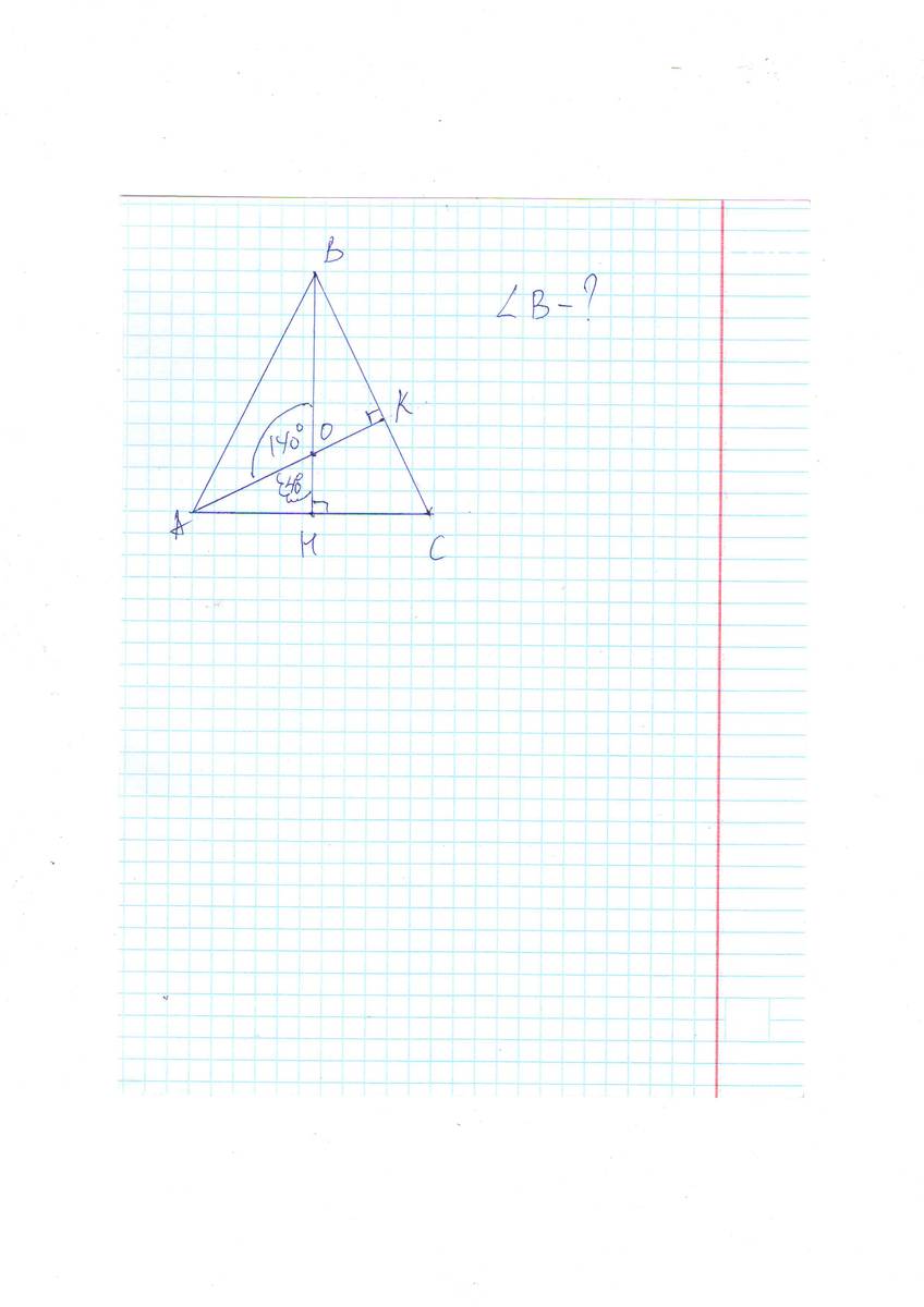 Высоты равнобедренного треугольника , проведенные из вершины при основании и из вершины, противолежащей основанию, при пересечении образуют угол в 140. Найдите угол, противолежащий основанию. (с рисунком если нужно)