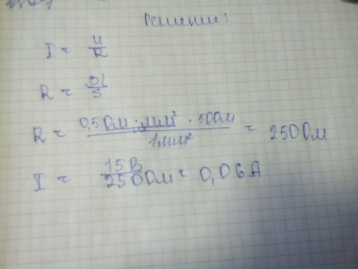 Найдите силу тока на участке проволоки длиной 500 м, сечением 1 мм2, если напряжение на ее зажимах 15В, а удельное сопротивление 0,5 Ом*мм2/м