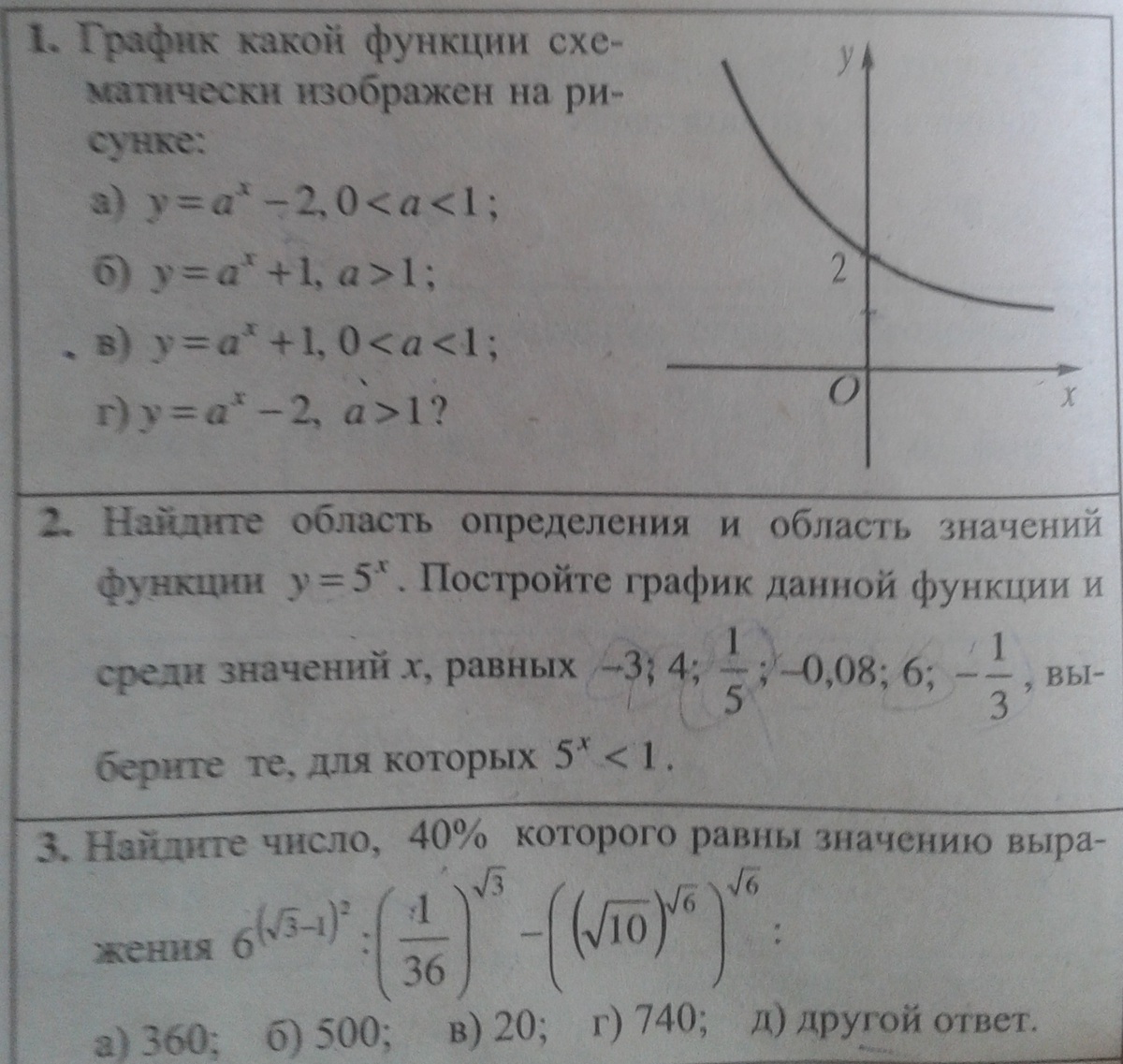 1) На рисунке изображен график показательной убывающей функции, значит параметр а лежит в промежутке 0<a<1