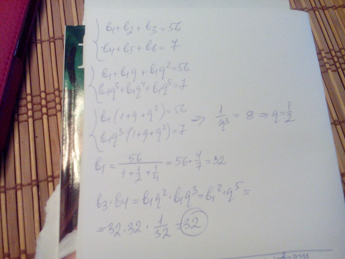 cумма трех первых членов геометрической прогрессии равна 56, а сумма трех последующих ее членов равна 7. Найдите произведение третьего и четвертого членов этой прогрессии