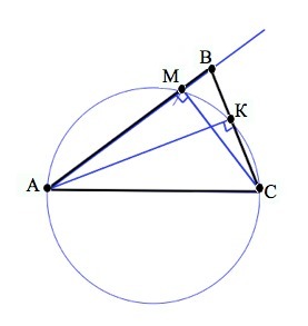 Пусть заданы отрезки: АС - сторона треугольника, АК и СМ - его высоты.. Требуется построить треугольник по данным элементам. • 1) На произвольной прямой откладываем отрезок АС, равный данной стороне. • 2) По известному методу деления отрезка пополам находим середину О отрезка АС и из О радиусом, равным АО, чертится окружность. • 3) Из А на построенной окружности отмечаем циркулем точку К ( длина АК равна длине одной из данных высот). Из точки С таким же образом на окружности отмечаем основание М второй высоты. • 4) Из точки А через М проводим прямую, из точки С через К проводим вторую прямую. Точку пересечения этих прямых обозначим В. Треугольник по стороне АС и высотам АК и СМ построен: Длина АС задана условием. Углы АКС и СМА прямые - опираются на АС как на диаметр окружности. Следовательно, АК - высота к ВС, СМ - высота к АВ.