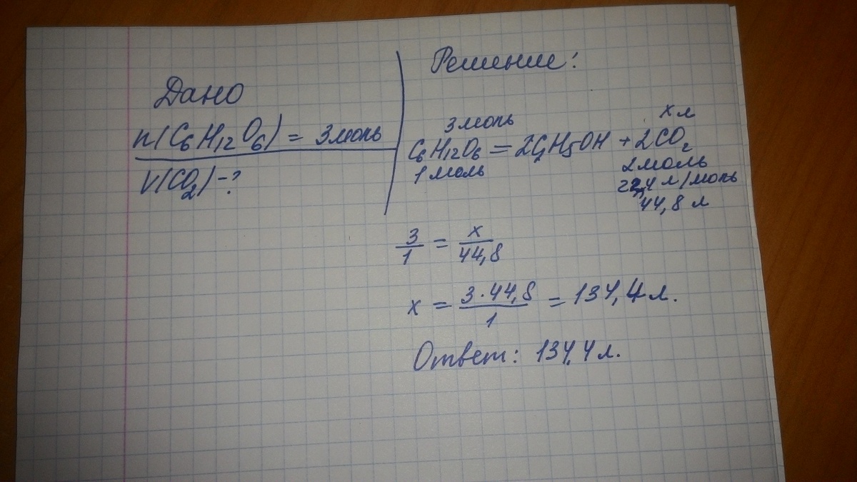вычислите объем углекислого газа(н.у), выделяющегося при брожении 3 моль глюкозы.
