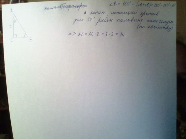 В прямоугольном треугольнике ABC угол С равен 90 градусов.найдите длину гипотенузы AB,если угол А равен 60 градусам,а катет АС равен 7.