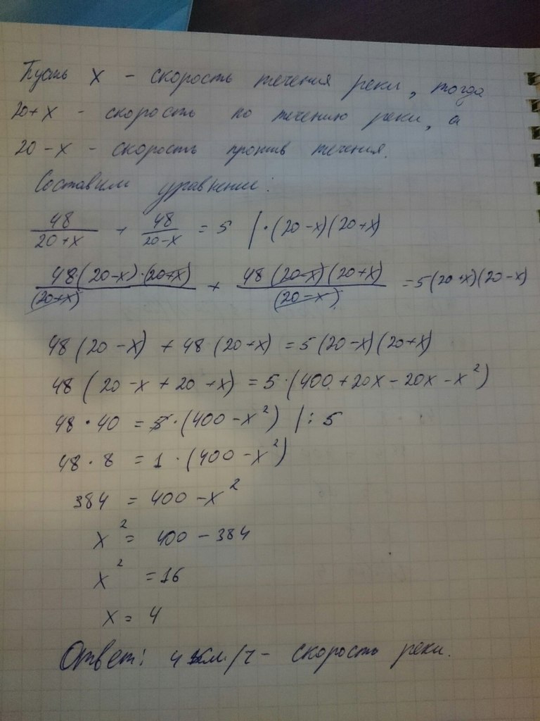 Пароход прошел по реке 48 км по течению и столько же против течения, затратив на весь путь 5 часов. Найти скорость течения реки, если скорость парохода в стоячей воде равна 20 кмч .