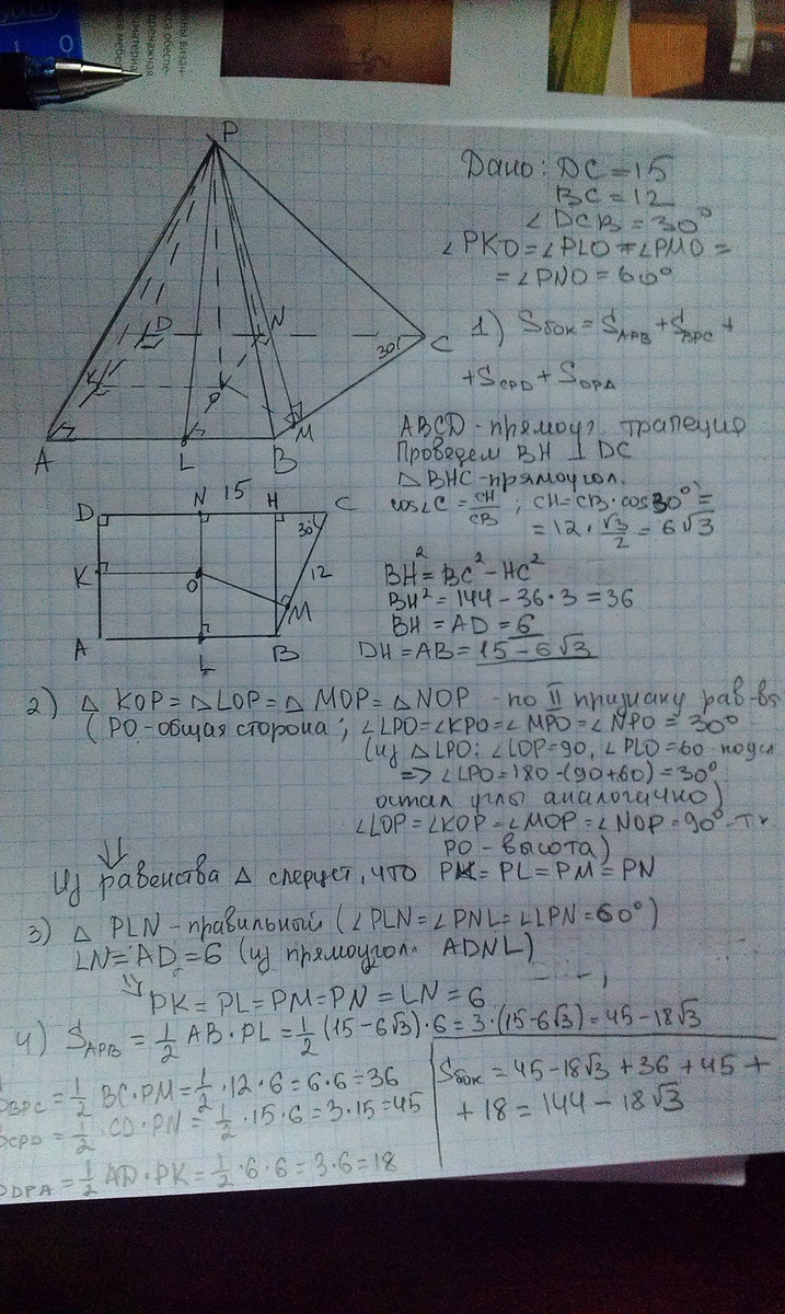 Основание пирамиды-прямоугольная трапеция, у которой большая из параллельных сторон равна 15 см, а большая из непапараллельных сторон равна 12 см и меньший угол равен 30 градусам. Все двугранные углы при основании равны по 60 градусов. найти боковую поверхность пирамиды