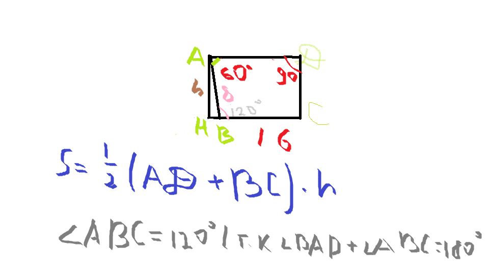 вычислите площадь тропеции АВСД с основаниями АД и ВС,если АВ= 8 см,ВС=16 см,<А=60 градусов, < Д= 90 градусов.