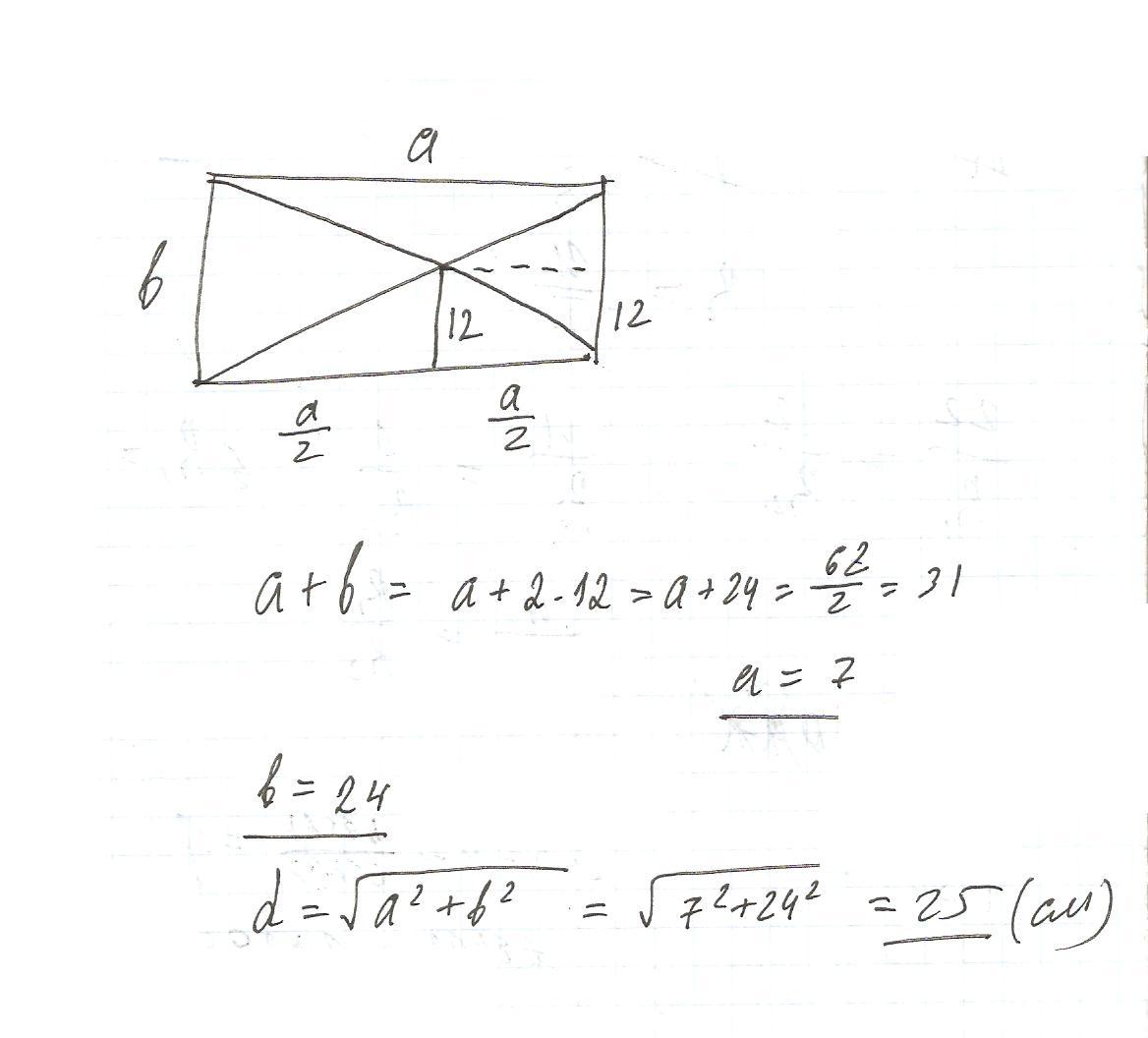 Периметр прямоугольника равен 62 см , а точка пересечения диагоналей удалена от одной из его сторон на 12 см.Найдите длину диагонали прямоугольника