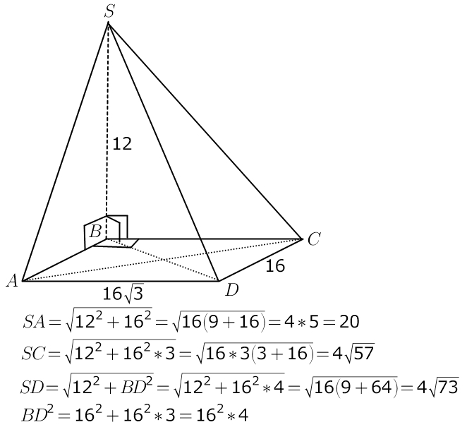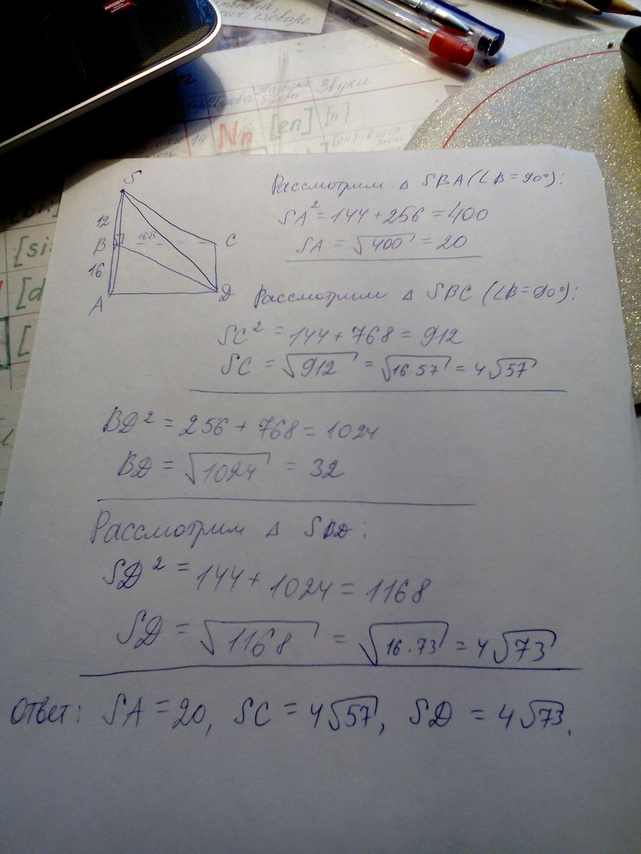 Основание пирамиды-прямоугольник,стороны которого равна 16 корней 3 см и 16 см.Высота пирамиды проходит через вершину основания и равна 12см/